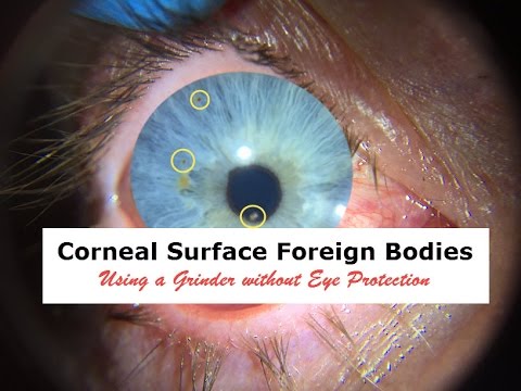 Eye Surface }}- This patient was using a grinder without eye protection which resulted in three metallic foreign bodies landing on the surface of his eye. The foreign bodies were ...